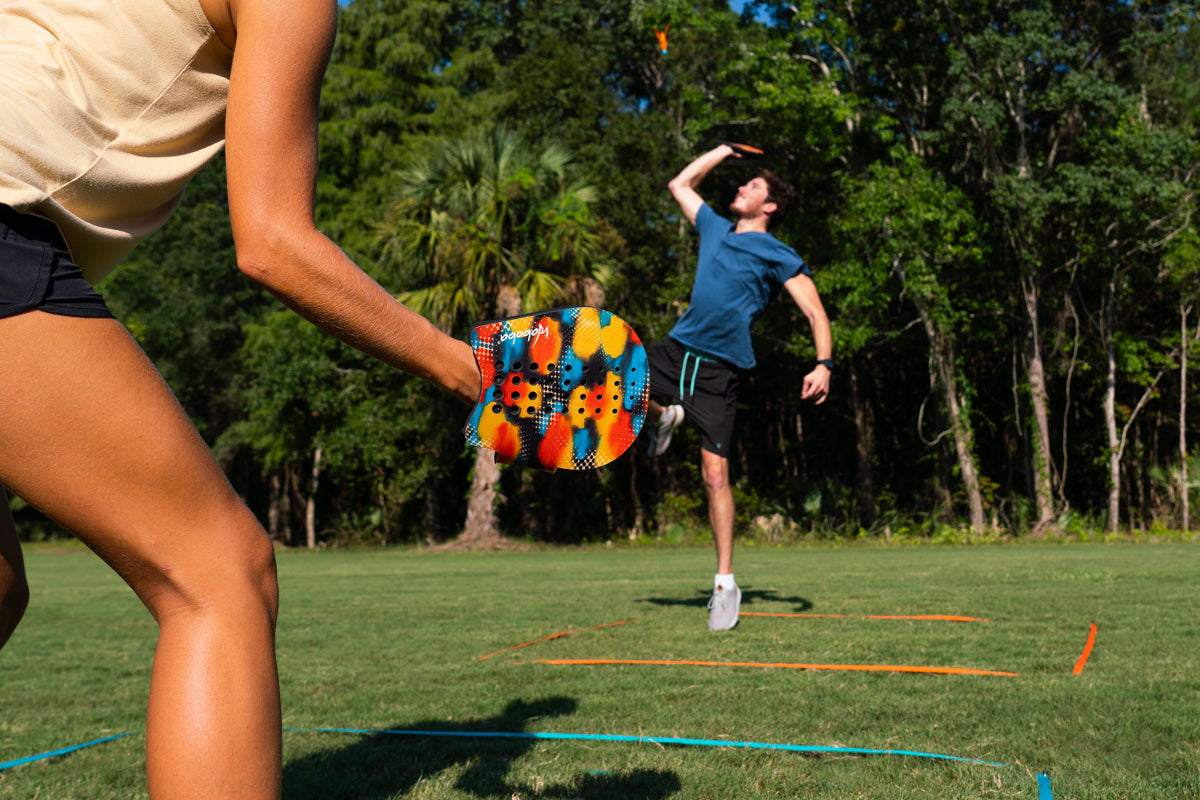 Similar to Badminton and Pickle Ball, hit the birdie with the VOLI hand paddles to land in your opponent’s square to score points.