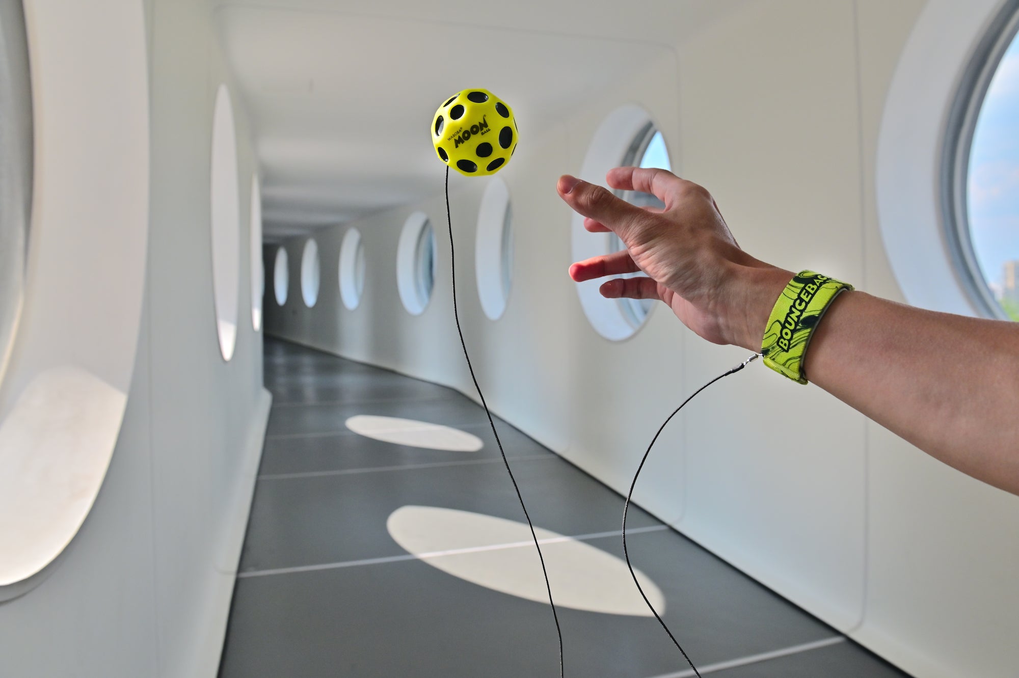 Take your Moon Ball for a walk and Bounceback whenever you need a break. Strap in and experience the Moon Ball in a whole new way. Bounceback features a Moon Ball on a leash you wear with an adjustable wristband. It's addictive to bounce everywhere! Simply throw it in front of you so it bounces and catch it on the rebound!